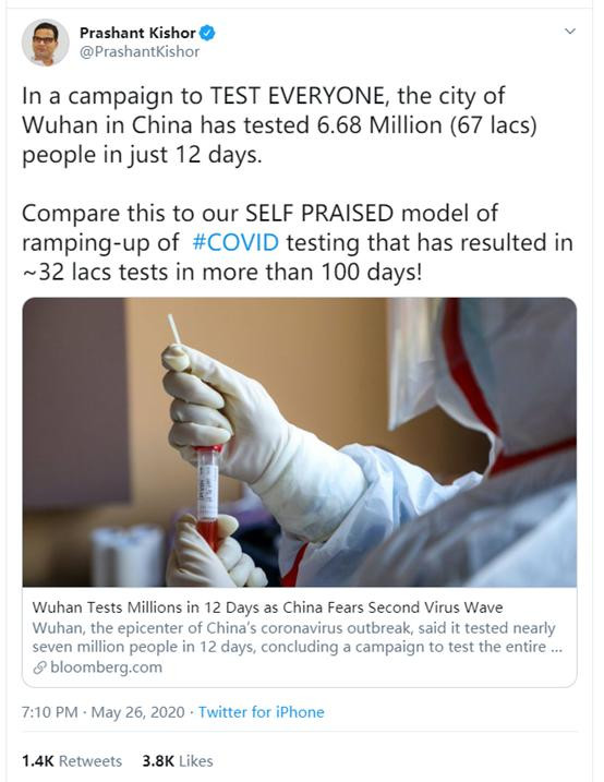 還有一些其他國家的網民,也在拿武漢的檢測量督促自己的國家對檢測的事情認真起來,比如下面這位印度網民: