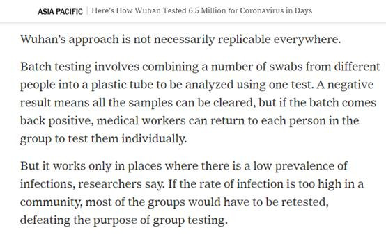 ▲截圖來自澳大利亞廣播公司的報道《紐約時報》還在報道中提到了為什麼武漢這種大規模檢測無法在美國等其他疫情嚴重的國家複製的原因,稱武漢採取的快速 " 混檢 " 方式,即將多個不同樣本(5-10 個)混合在一起進行一次檢測的方式,只適用於感染情況不嚴重的地方,因為一旦檢測中出現陽性,那麼就得將被混合的樣本拆開一個個進行進一步的檢測。所以,若在疫情嚴重的地方採用這種檢測方式,就意味着每一個合併檢測的組恐怕都要拆開再進行單獨檢測,這樣反而事倍功半了。