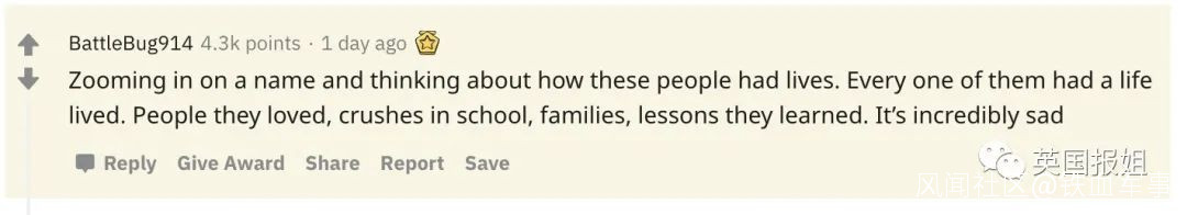 “細看一個名字,然後想到他們都有自己的生活。他們每一個人都過着自己的生活。他們有自己愛的人,有校園的愛戀,有家人,有他們學到的教訓。這實在是太難過了”