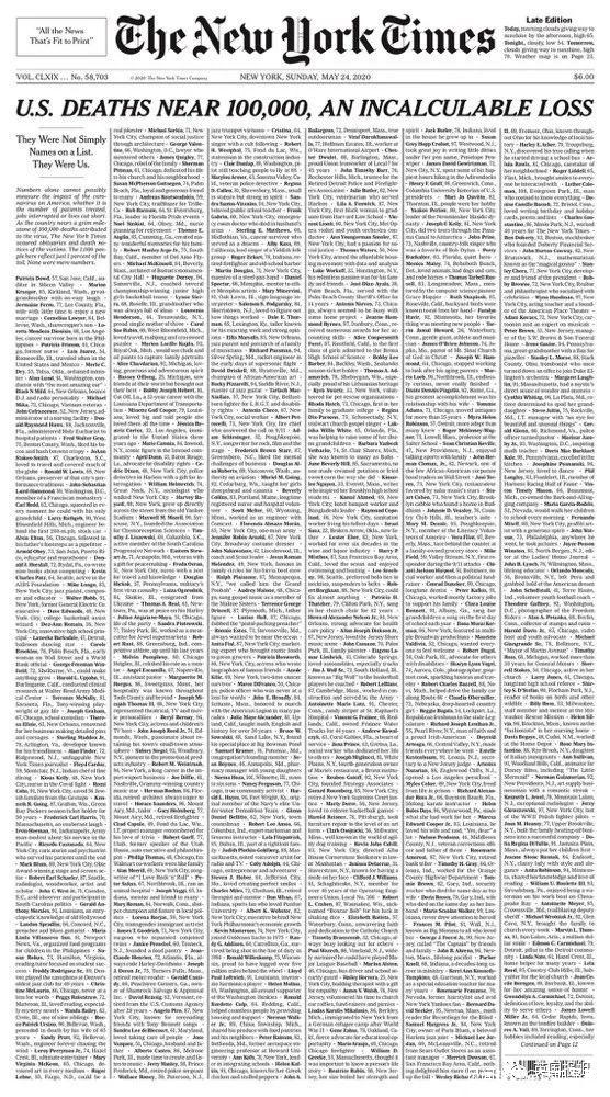 紐約時報在頭版頭條發佈訃告,是在盡他們所能讓美國人不被持續的死亡所麻木,讓他們對每一個死者都產生共情。
