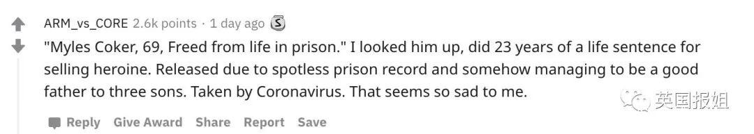 “Myler Coker,69歲,終身監禁之後被釋放。我查了他的資料。他因為賣毒品在監獄裏待了23年。後來因為表現良好被釋放。他成為了3個孩子的好父親,最後被新冠病毒殺死。我太難過了”
