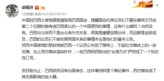 胡錫進:巴西議員在台灣問題上蹭流量 該給他臉嗎?(新浪)_風聞
