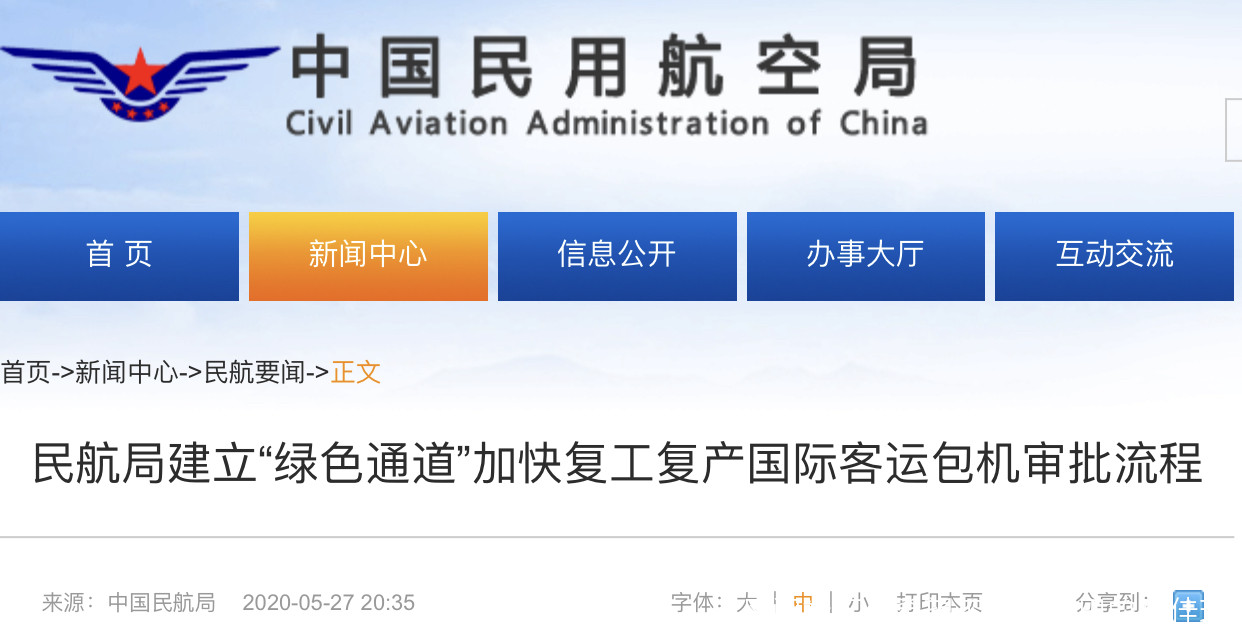 5月27日,中國民航局在其官網發佈了《關於建立復產復工國際客運包機計劃審批“綠色通道”的通知》。通知中指出,對經國務院聯防聯控機制(或其外事組)批准,或者符合中外快捷通道要求的復產復工國際客運包機計劃審批工作程序進行臨時性調整,建立“綠色通道”,優化工作流程、縮短辦理時間。