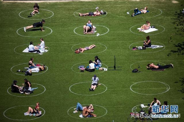 圖片説明:5月27日,在美國紐約,人們在草坪上限制社交距離的圓圈內休閒。美國約翰斯·霍普金斯大學27日發佈的新冠疫情最新統計數據顯示,美國累計死亡病例超過10萬例。(來源:新華社郭克攝)