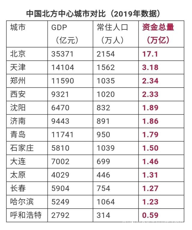 上面是中國北方重要城市的力量對比。GDP是官員們最重視的,但也是不太可靠的。常住人口,説實話也不太可靠。只有資金總量數據,是央行系統統計的,沒有納入政績考核,有比較大的參考價值。