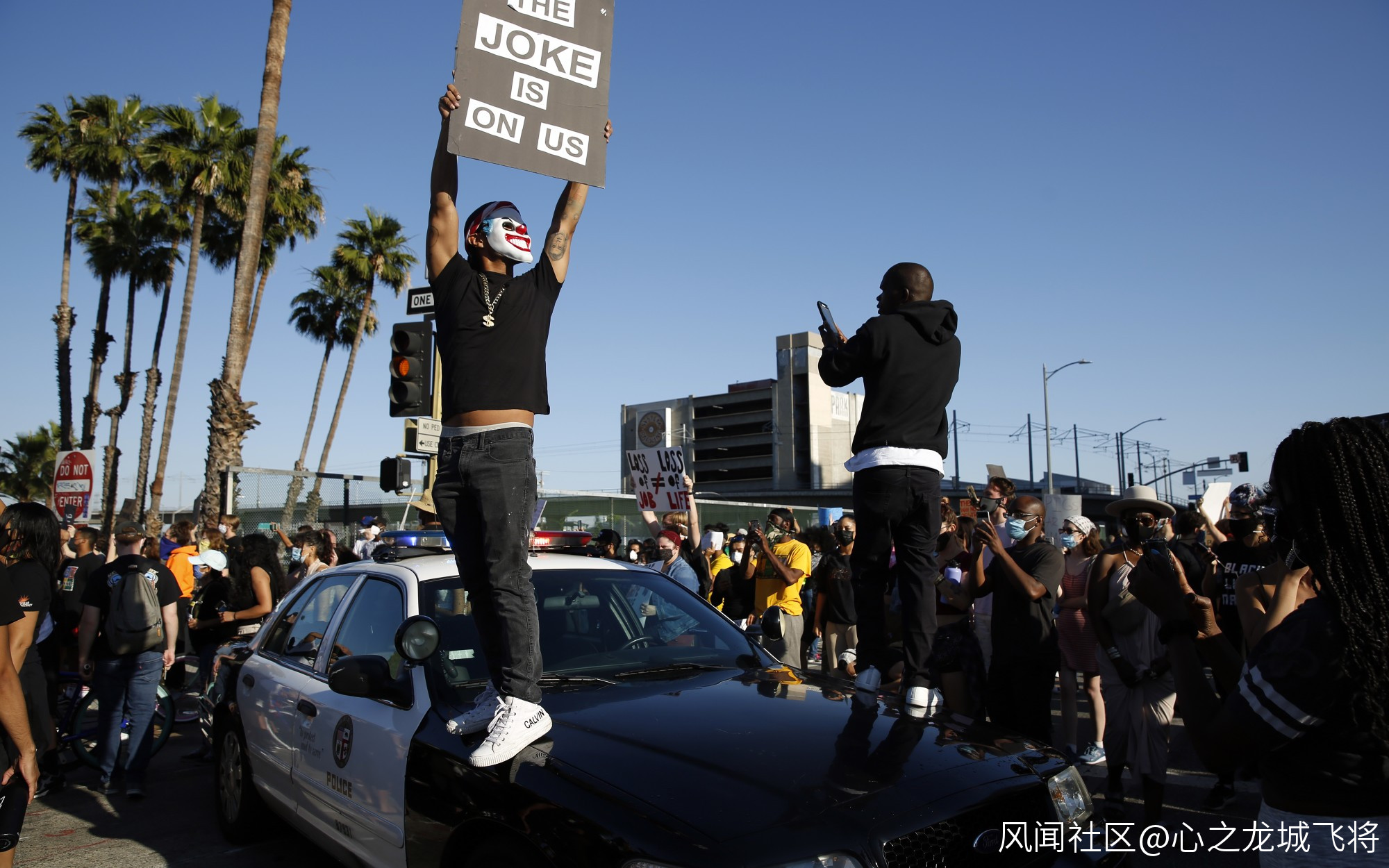 據《洛杉磯時報》報道,數百名抗議者在洛杉磯市中心聚集,一度衝上高速公路阻攔交通,並與警察巡邏車對峙,還有示威者當街焚燒美國國旗。