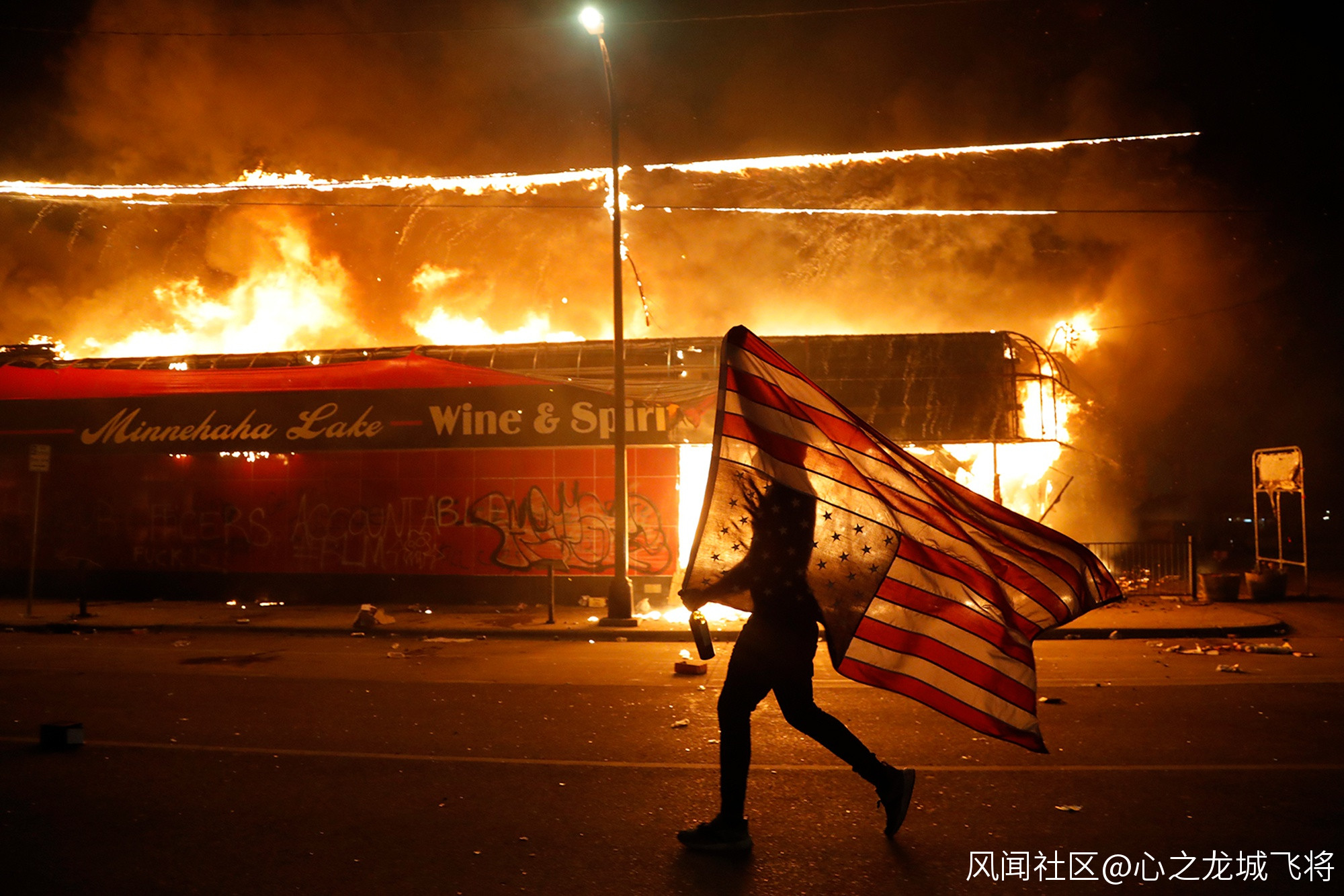 28日,明尼阿波利斯市,一名抗議者倒拿美國國旗奔跑。(美聯社) 報道稱,在明尼蘇達州的兩座城市——明尼阿波利斯和聖保羅,都發生了大規模的抗議活動。在聖保羅,抗議者與防暴警察對峙,來回投擲催淚彈。警方説,超過170家企業遭到抗議活動洗劫或破壞。