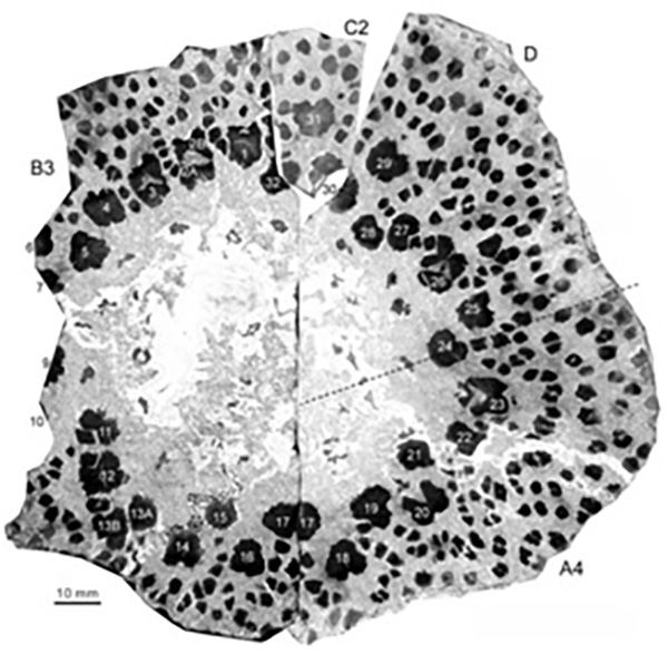 中科院南京地質古生物研究所研究員徐洪河展示在塔城地區發現的枝蕨類植物化石橫截面。新華社發