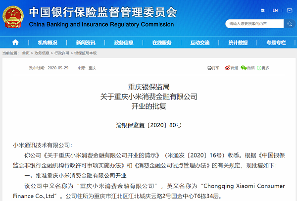 第26家消費金融公司獲批開業!5月29日,重慶銀保監局官網發佈關於重慶小米消費金融有限公司(以下簡稱“小米消費金融”)的開業批覆。而此前便有消息稱小米消費金融將於5月30日正式開業。