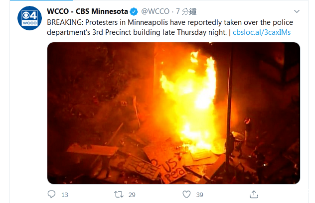 據美國明尼蘇達州地方媒體“WCCO - CBS Minnesota”剛剛消息,當地時間28日深夜,明尼蘇達州明尼波利斯的抗議者“接管”了當地警察局第3分局大樓。