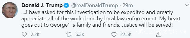 同一天,特朗普還在推文中寫道:“應我的要求,聯邦調查局(FBI)和司法部已經就喬治·弗洛伊德在明尼蘇達州非常讓人悲痛且悲慘的死亡事件展開調查……”↓