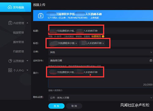 你看視頻製作難不難?其實不是難,難的是小白沒做過。但只要一接觸,絕對是超級簡單。混剪視頻就是最簡單的一種,也是效果好的一種。模塊五:發佈視頻的技巧視頻做完之後就是發佈視頻,發佈視頻技巧在於標題、描述以及標籤上的長尾詞。因為我們做視頻引流主要通過長尾詞引流。所以你首先手裏要挖掘大量的長尾詞,而長尾詞就是標題。一般我們才做的就是雙拼長尾詞,比如XXX引流課程多少錢,XXX人長的帥不帥,這種長尾詞拼在一起形成標題。當然,手動拼接很累的,能用軟件就用軟件吧,我們這邊都用的是軟件去拼接長尾詞,一次性大量拼接N個詞。我説下核心技巧:標題和描述和標籤都是長尾詞,要部署在發佈頁面上。發佈細節如圖: