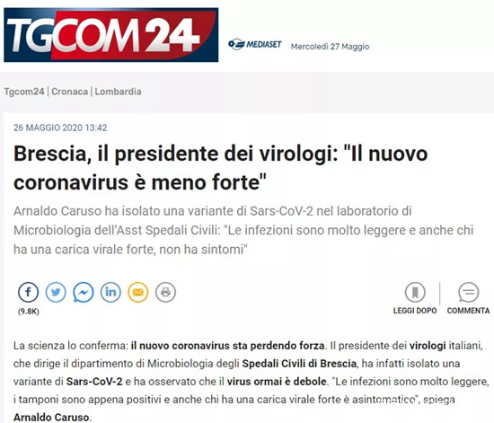 綜合意大利Tgcom24網站、《晚郵報》26日報道,Caruso表示,最近一段時間,絕大部分檢測拭子裏的病毒載量都很低,有一個病毒載量非常高的拭子讓我們感到非常驚訝,因為這名感染者是一名無症狀患者。所以,我們將該病毒分離出來,發現它比以前的病毒毒性要弱得多。換句話説,這種病毒的攻擊性變弱了,“它甚至無法殺死所有細胞”。
