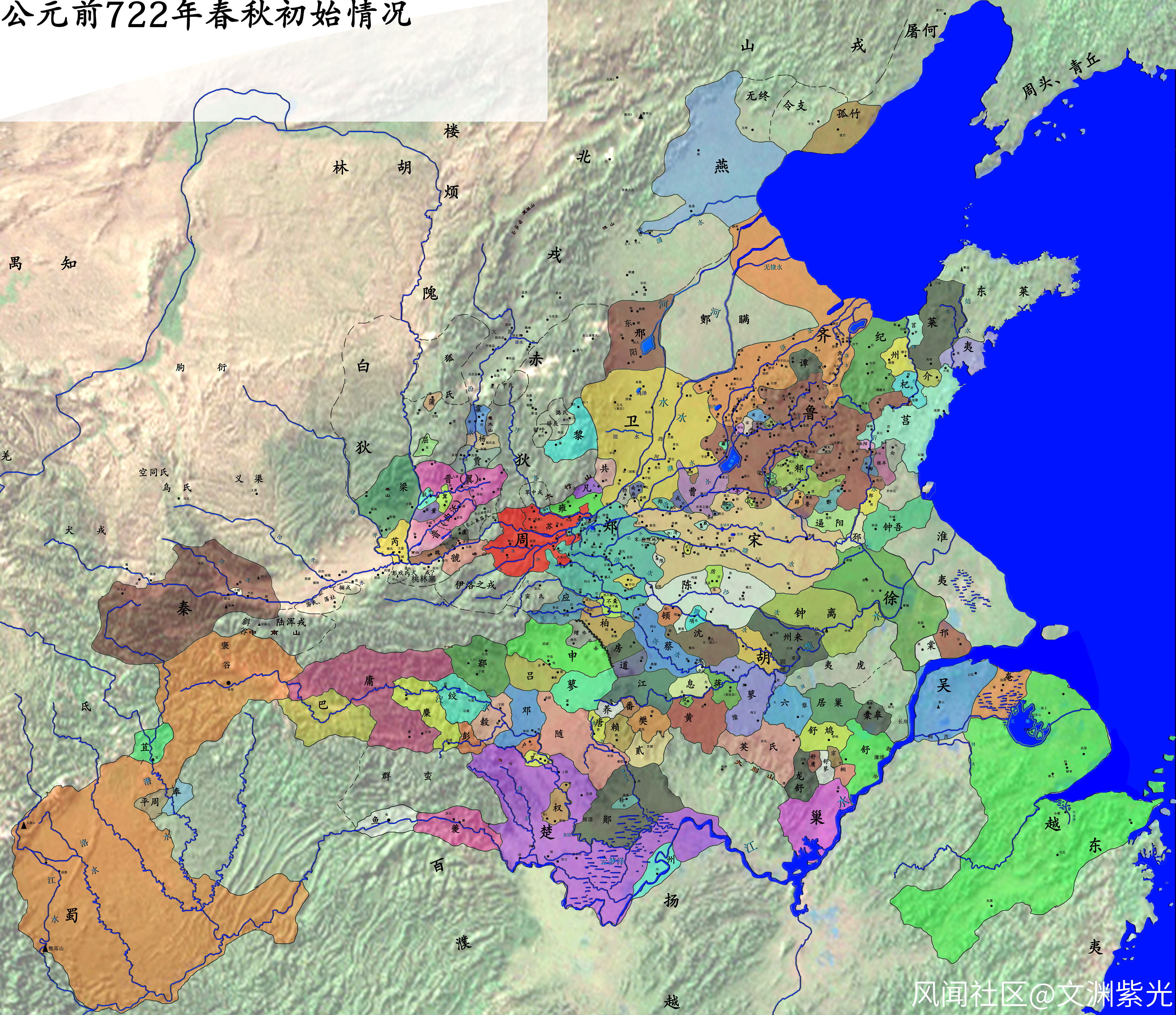 周平王封秦襄公為伯爵諸侯(公侯伯子男五等中的第三等),賜給他岐山以西的土地,秦始建國。如下為當時天下諸國圖。