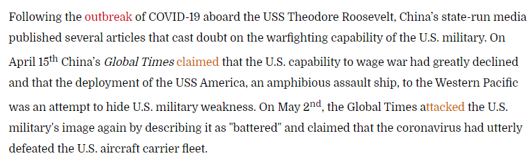 所以,與其説是我們《環球時報》以及另一家中國媒體CGTN(注:該網站還將CGTN的名字搞錯了,説成是環球時報旗下的媒體了。。。。。。)對美軍發動“心理戰”,這家美國軍事網站還不如去指責一下美國的主流媒體為什麼要曝光美國軍隊的疫情情況。