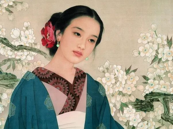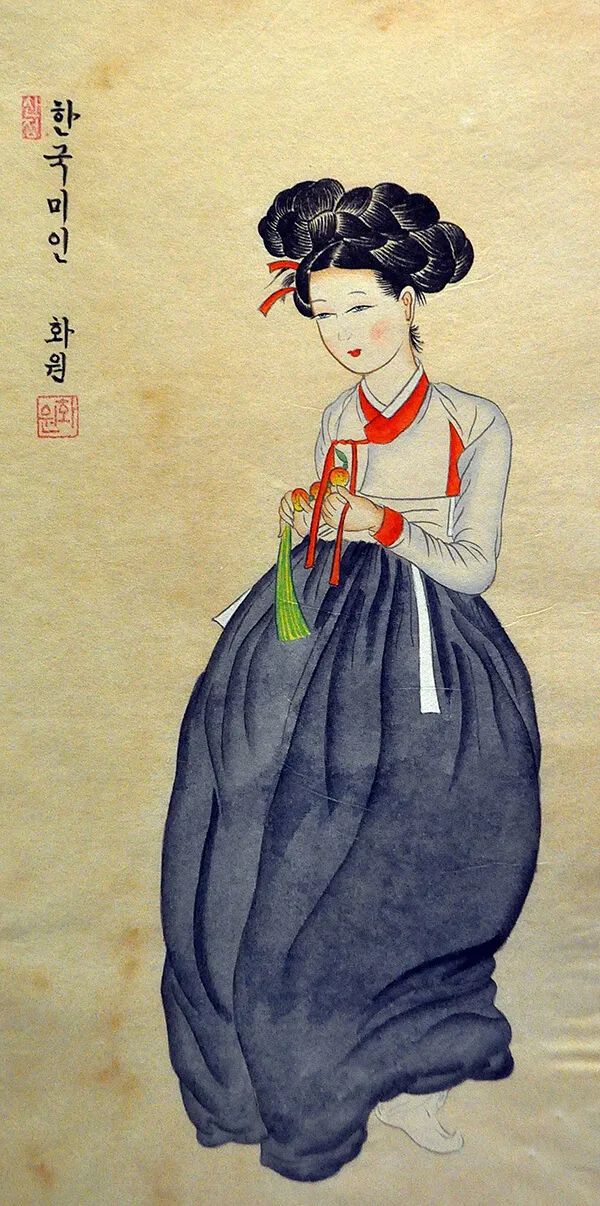 古代的韓國美女,注意她有杏仁狀的眼睛,高鼻子,小嘴唇和長形的臉(而不是V臉)。