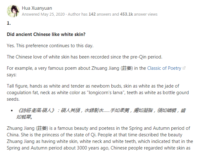 在莊姜之後的時代裏,中國人一直把白皙的皮膚視為美麗的象徵。許多文學作品,如詩歌和小説,常常這樣描述一個美人的皮膚:“膚白如雪”、“膚如凝脂”。