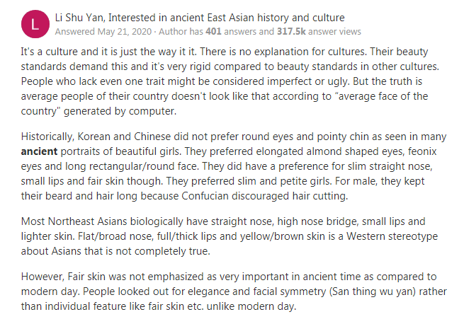 本人譯自Quora問答,原標題:Why do Korean and Chinese people like White skin, rounded eyes, high bridge nose and pointy chin? 為什麼韓國人和中國人都喜歡白皮膚、圓眼睛、高鼻樑和尖下巴?