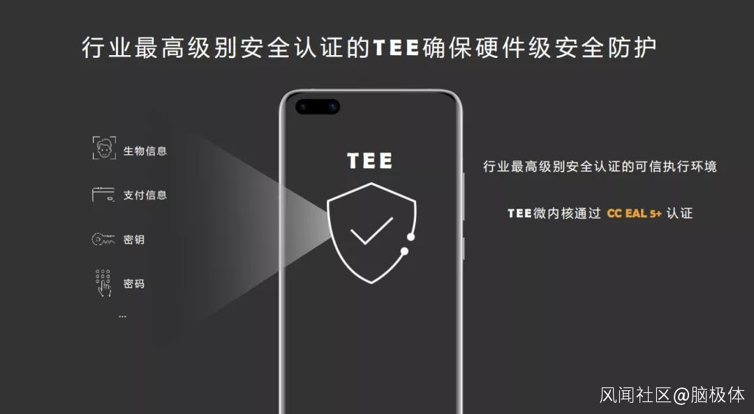 舉例來説,華為手機中有一個非常重要的安全技術,就是基於麒麟芯片構建的硬件隔離可信執行環境——TEE(Trusted Execution Environment) OS。這一基於底層芯片建立的隔離環境,在安卓開放環境以外,構建了一個單獨的空間,將用户敏感數據的管理、加密、驗證、存儲全流程隔離保護運行。