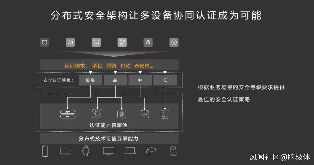 假如多設備可以從不同的維度來識別用户不同的生物特徵,那麼手機識別的問題將迎刃而解。比如説、心電圖規律、聲紋特徵、指紋、人臉、虹膜,這些生物特徵從不同方向,可以被不同設備識別和校驗,它的可靠性也就隨之提升。在華為手機中,目前已經部署了創新的生物識別模塊,實現了3D結構光人臉識別+屏下指紋識別雙安全保障;而在未來的分佈式系統中,華為智慧全場景會從不同維度構建用户的認證資源池,這個資源池將根據操作級別和設備級別來決定互證方式。在用户需要高等級認證,完成諸如支付等重要任務時,分佈式系統會儘可能多地調集多維度識別,確保用户信息正確有效。而在低安全需求場景,用户可以通過諸如指紋識別快速通過。