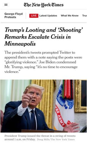 特朗普這條推文立即被推特判定並標註為“宣揚暴力”,違反了推特內容發佈的相關條例。特朗普對此大為惱火,立刻發文指責推特此舉是故意針對“共和黨、保守派和美國總統”,並要求助手將其原始推文轉發到白宮官方推特賬户上。推特方面則在後續推文中留言:“我們採取行動是為了防止其他人受此啓發實施暴力,之所以仍將該推文保留,是因為考慮到該推文與正在發生的重大公共事件相關,有必要讓公眾仍然能夠讀到該推文。”