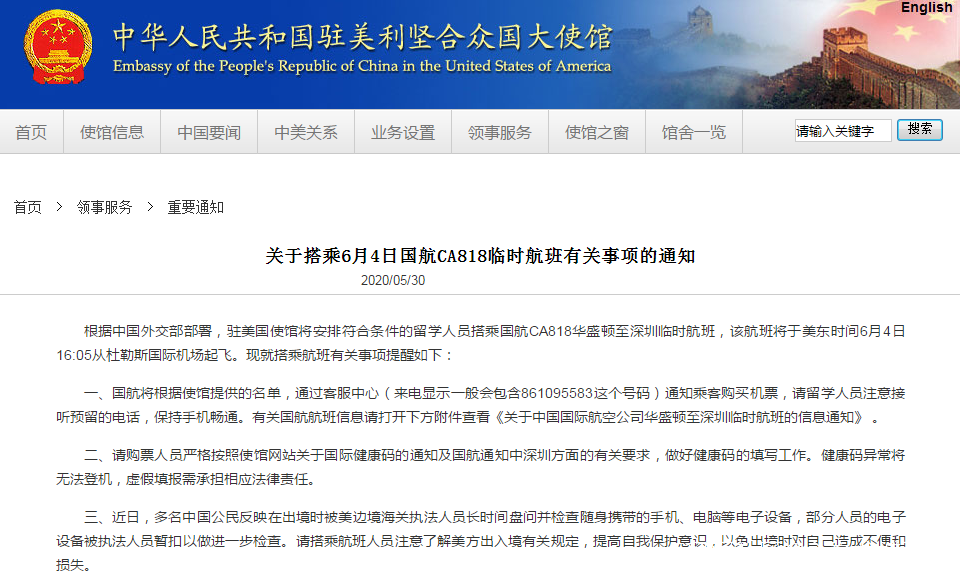 根據中國外交部部署,駐美國使館將安排符合條件的留學人員搭乘國航CA818華盛頓至深圳臨時航班,該航班將於美東時間6月4日16:05從杜勒斯國際機場起飛。現就搭乘航班有關事項提醒如下: