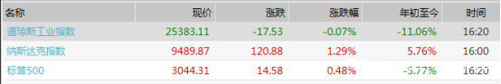 截至美股收盤,道指跌幅0.07%,報25383.11點;標普500指數漲0.48%,報3044.31點;納指漲幅1.29%,報9489.87點。
