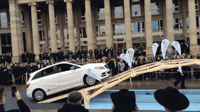 實驗中的橋叫做“編木拱橋”,據説最早是由達芬奇設計的。用類似的結構做出的橋,不需要用任何鉚釘進行連接(與榫卯結構類似),就能穩定地架起來,甚至可以讓汽車在上面通行。