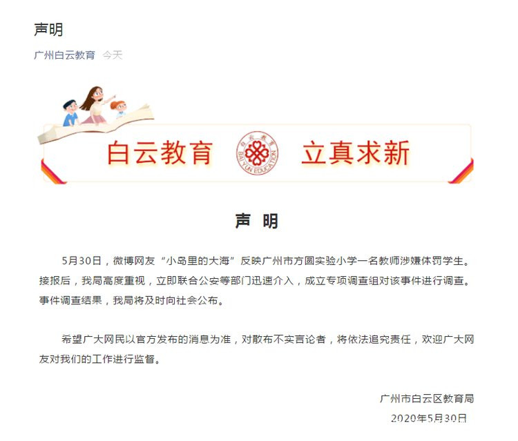 據廣州市白雲區教育局微信公眾號消息,5月30日,微博網友“小島裏的大海”反映廣州市方圓實驗小學一名教師涉嫌體罰學生。接報後,教育局高度重視,立即聯合公安等部門迅速介入,成立專項調查組對該事件進行調查。事件調查結果,教育局將及時向社會公佈。