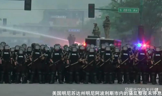 事件“風暴眼”美國明尼蘇達州明尼阿波利斯市內的騷亂,28日整夜未停息。在示威者“接管”並縱火燒警局大樓後,當地時間29日凌晨,仍有大批示威者聚集在明尼阿波利斯市街頭抗議,大火也依舊在燃燒。即使警察使用暴力以驅散人羣,現場還是有示威者不斷地向警察投擲石塊。