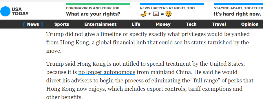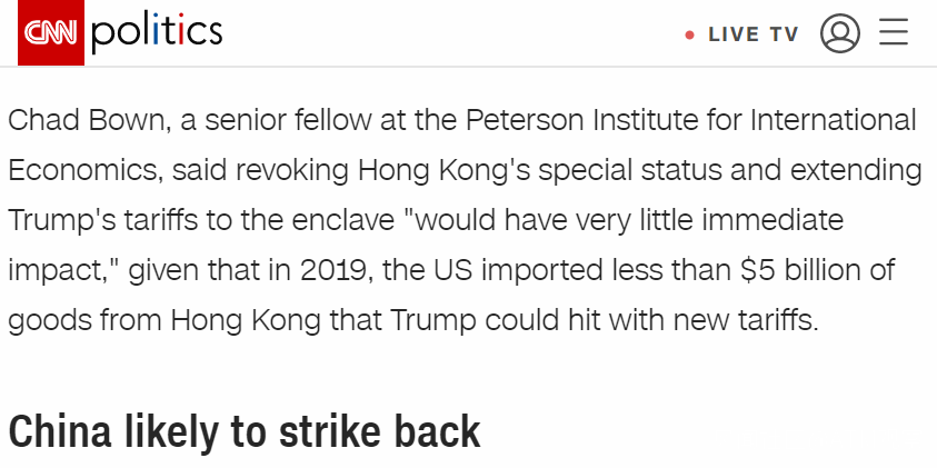 《今日美國》認為特朗普的政策是想損害香港作為“國際金融中心”的地位。CNN採訪的專家則表示,解除美國對香港的優待地位和增加關税對香港當即造成的衝擊很小,原因之一是去年美國總共從香港進口的貨物還不到50億美元。