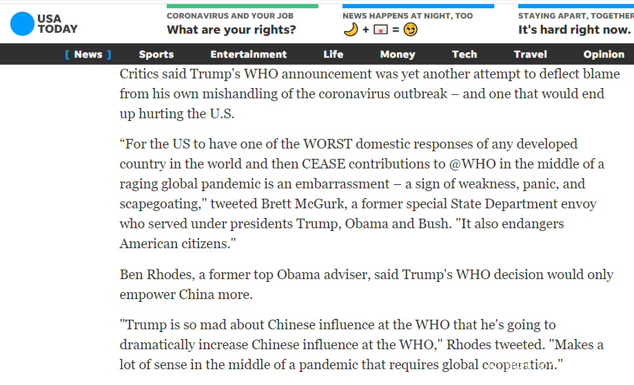 《今日美國》還認為美國國會可能不會支持特朗普退出這個國際組織。多名前總統奧巴馬時期的美國官員則表示特朗普在美國的新冠肺炎疫情如此嚴重的情況下做出這個舉動,只會令美國在國際上被人鄙視,認為美國是在無能狂怒,而且退出這個重要的國際組織更會在損害美國國際影響力的同時,增強中國的影響力。