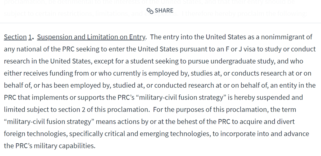 而在美國白宮的官網上,目前也只看到特朗普宣佈第四項攻擊中國的政策具體細節。其具體內容是禁止和限制在支持中國“軍民融合戰略”的中國機構中工作、學習和從事科研的學士學歷以上人員,通過F和J類簽證(即學生簽證和訪問交流簽證)進入美國。但對於近幾年已經在被不斷針對和打壓的中美科研合作領域來説,這一限制中國的政策確實“乏善可陳”。