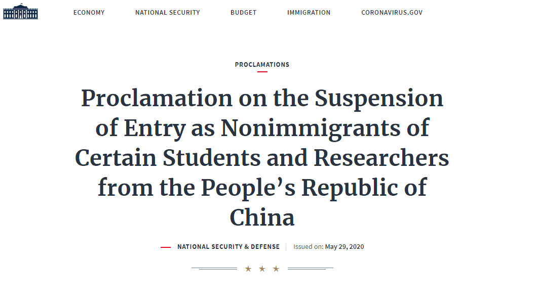5月29日,美國總統特朗普發佈公告稱,美國限制特定中國學生及研究人員入境,因為他們可能威脅美國的安全。