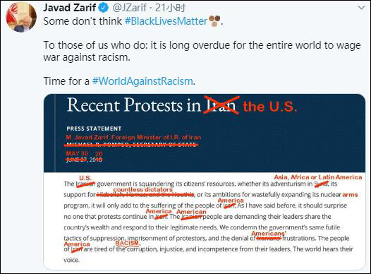 同時讓福克斯新聞感到不爽的還有伊朗。最近伊朗外交部長穆罕默德·賈瓦德·扎裏夫在推特發佈了一篇經過修改的2018年美國國務卿蓬佩奧針對伊朗聲明的新聞稿。