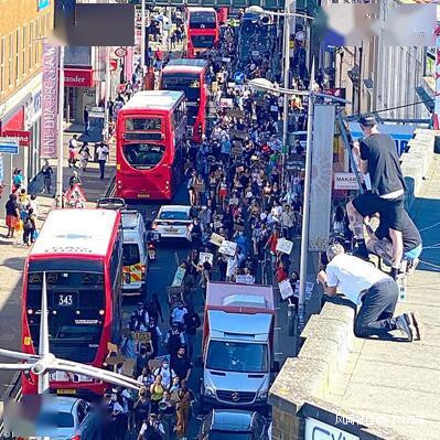 據報道,示威者們堵塞了交通,讓主幹道上的公交和汽車等寸步難行。在抗議活動中途,還有示威者嚷道:“英國也不是無辜的!於此同時,還有小部分示威者在美國駐倫敦大使館外發起抗議,要求為弗洛伊德伸張正義。