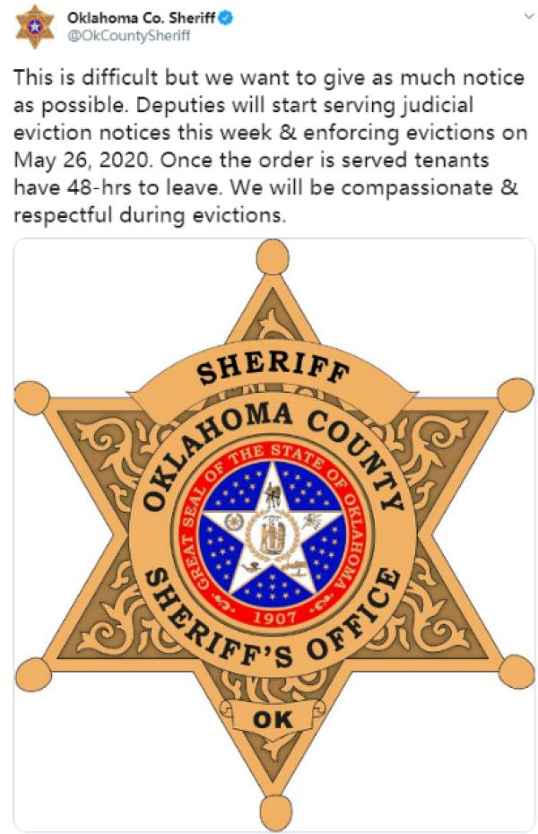 △俄克拉荷馬縣警察局在社交媒體通知將根據法院判決驅離拖欠房租的租客