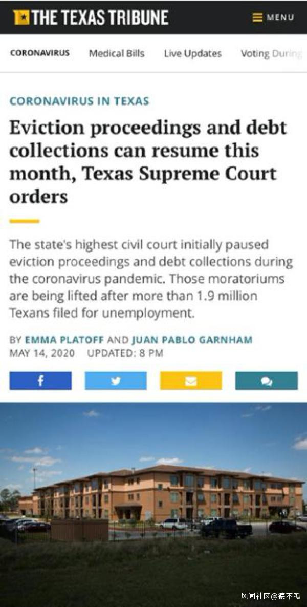 △《得克薩斯論壇報》報道稱,得州最高法院將恢復允許該州對被拖欠租金的討債和對租户的驅離行為