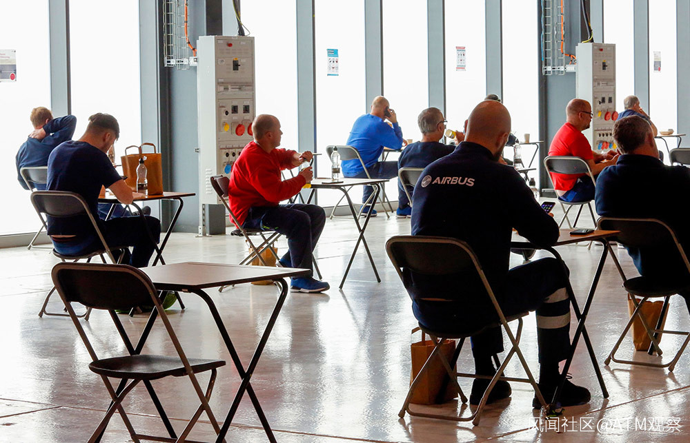 2020年4月30日,英國布勞頓的空客裝配廠,工人們坐在單人桌前,踐行社交距離。圖片來源:保羅·托馬斯/彭博社通過蓋蒂圖片社提供