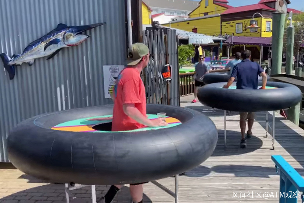 2020年5月16日,馬里蘭州海洋城的Fish Tales酒吧餐廳採用了一種更為古怪的方法,使用充氣內胎做成的“碰碰車餐桌”,確保顧客之間保持適當的社交距離。圖片來源:約翰·米德爾布魯克—路透社提供