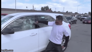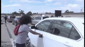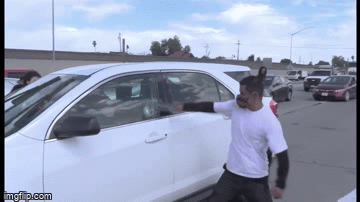 然而,這還不是網絡上唯一的砸車。這輛白色雪弗萊,一位女示威者,用腳猛烈踢踹。