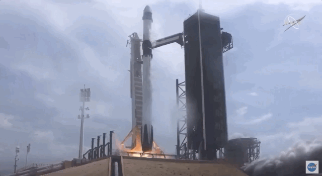 伴隨着轟鳴聲傳出與煙霧升起,獵鷹9號載着龍飛船和宇航員向太空前進。