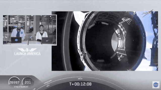 12分鐘10秒左右,火箭第二級與龍飛船完成分離。
