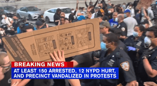 布魯克林籃網隊主場巴克萊中心外聚集示威者高舉“佛洛伊德”標語;警民數度爆發衝突,期間有民眾朝警方丟擲瓶罐,警察則兩度朝羣眾噴刺激眼睛的化學噴霧。