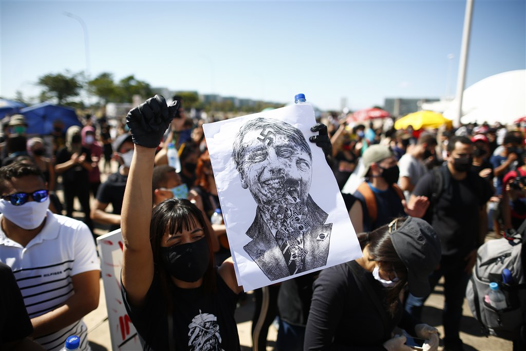 示威羣眾中許多人身穿黑衣、戴著口罩,手拿寫着**“所有人為民主站出來”(Everyone for democracy)、“反對種族主義和法西斯主義”(Against racism and fascism)、“政府的滅絕政策就是恐怖主義”(Terrorism is the government’s policy of extermination)**等內容的標語,在首都巴西利亞示威遊行,譴責總統波索納洛。