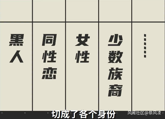 資本主義發明的身份政治則將社會政治豎切成羣體,法國‘發明’了種族,美國不斷按照種族和特徵等因素細化身份。而被細化了身份的無產階級,逐漸在理解上把階級矛盾認知為與其他身份羣體‘不平等’的矛盾,進而被統治階層分而治之、各個擊破。