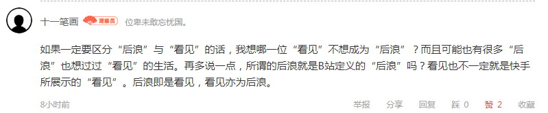 觀網風聞社區小編Real陳聰的《B站的表演再用力,在快手的真實面前都不堪一擊》中巧妙地用‘踩一捧一’的手法繼續把‘後浪’們挖出來供評論區的各路俠客們各種反覆鞭屍,然後怒贊一波抖音。我看到的其中一個相對理智的評論是: