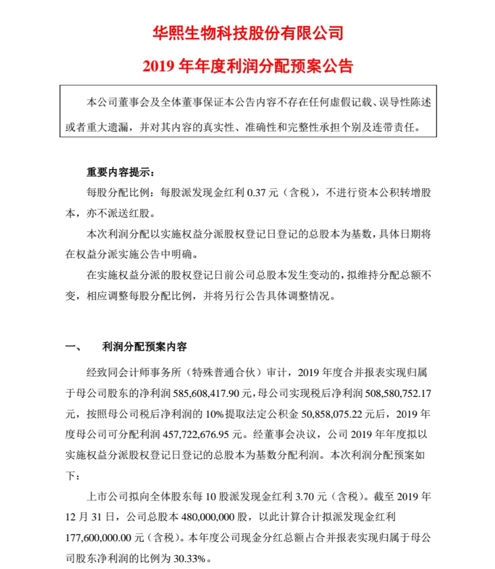 2020年4月29日,華熙生物發佈了利潤分配方案,稱擬每股派發現金紅利0.37元(含税),不進行資本公積轉增股本,亦不派送紅股。
