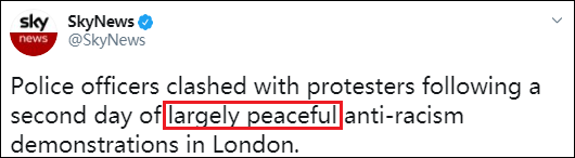 對於警方和示威者互有出手的激烈衝突,英媒將其描述為“基本上和平的反種族主義示威活動”: