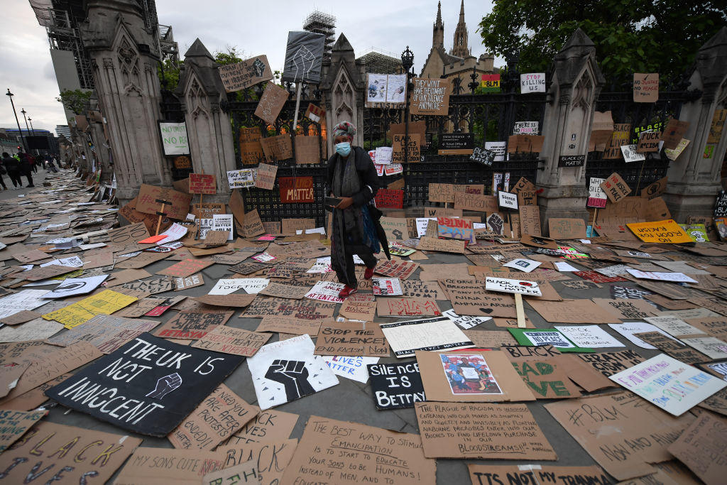 (抗議者堆砌標語牌,宣稱英國也有種族主義的份)